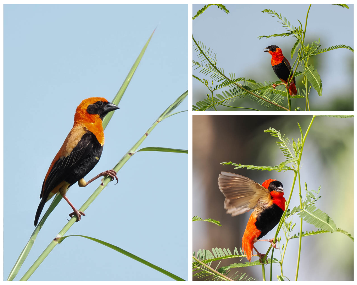 Onderweg zien we veel bisschoppen vliegen, geen echte natuurlijk, maar van die mooie gekleurde, in broedkleed zijn ze schitterend oranje-rood gekleurd, The Northern Red bishop en The Black-Winged Red Bishop (zie onderstaand)