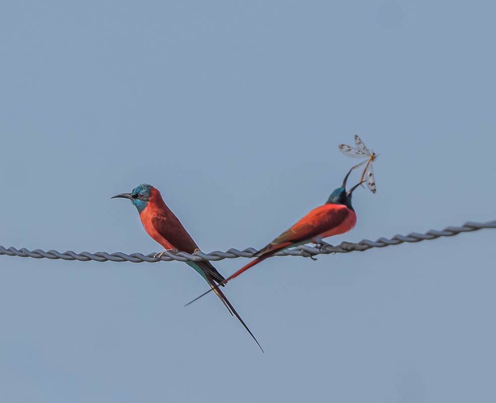 De volgende dag op tijd op, ontbijten en wegwezen, naar de Karmijnrode Bijeneters, in deze tijd zijn er niet veel, we hebben er twee gezien, jammer genoeg op de lijn en niet in de bomen, maar o, wat waren ze gaaf! Wat mooi, die kleur!