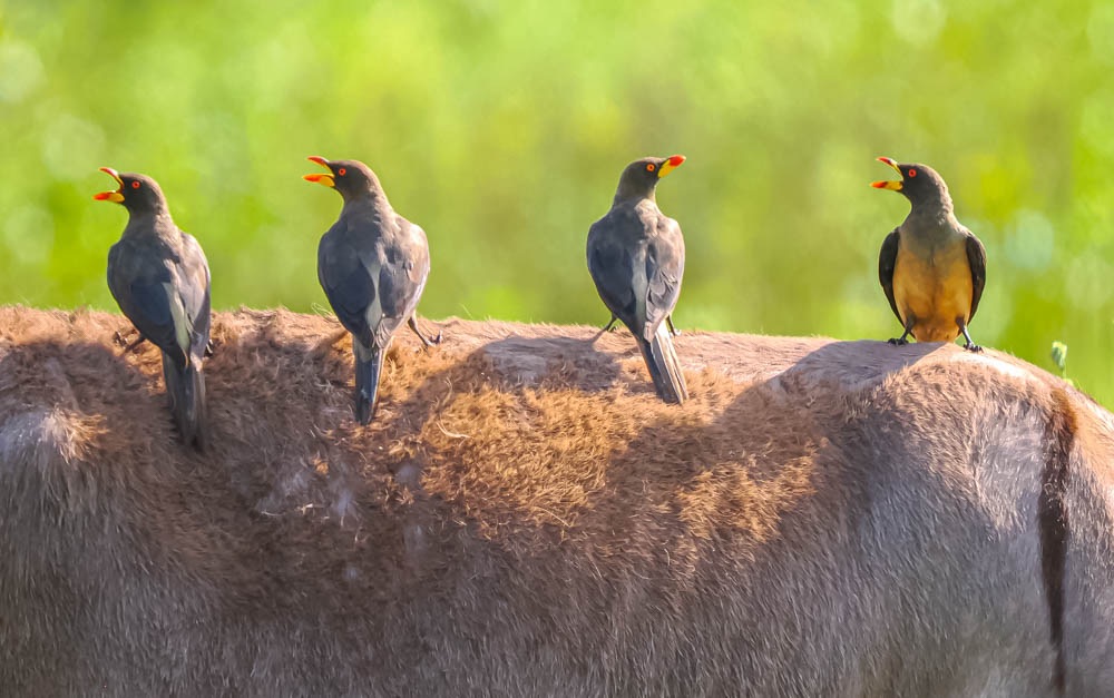 In Tanzania hebben we ze ook gezien, de Ossenpikkers, vogels die de gewoonte hebben om op grote zoogdieren, zoals neushoorns, buffels en giraffen, neer te strijken en daar teken, horzellarven en andere parasieten weg te pikken. In Gambia hebben we deze grote dieren niet, maar wel ezels en koeien.